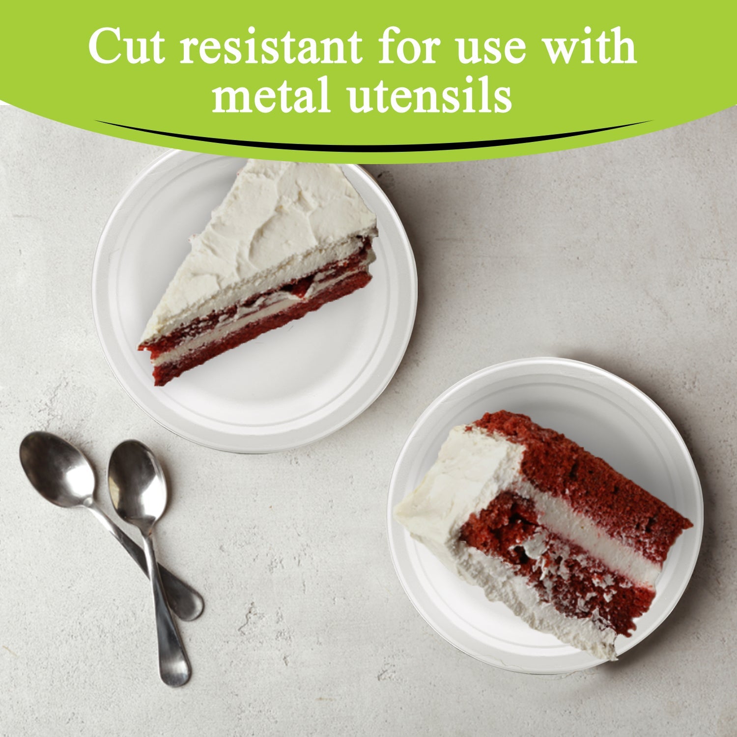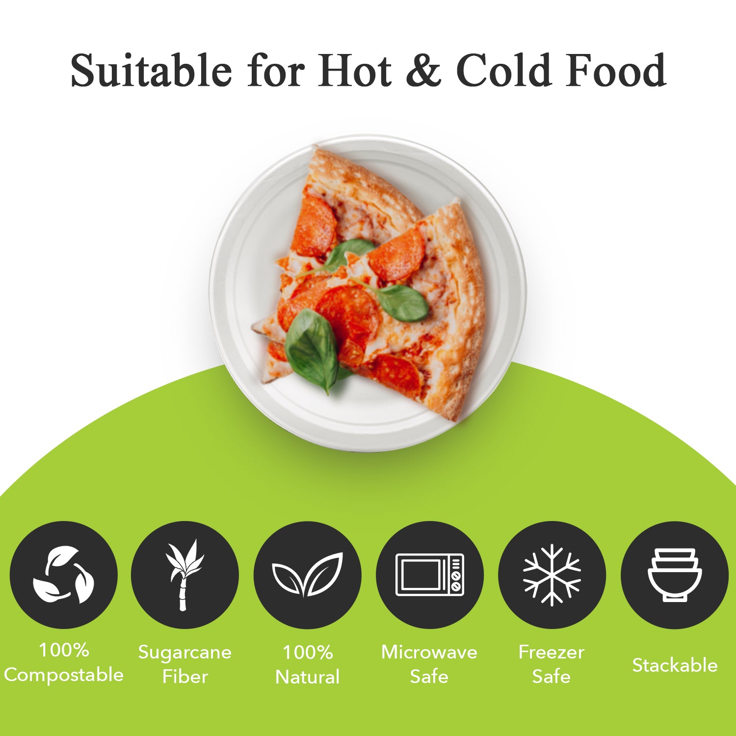 100% Bagasse Sugarcane Fiber: Use our bagasse disposable plate set to conveniently remember special occasions. This dinnerware is perfect for picnics and birthday celebrations thanks to its high quality. On a classy bagasse plate that is microwave safe and freezer safe, it is simple to offer heavy meals
