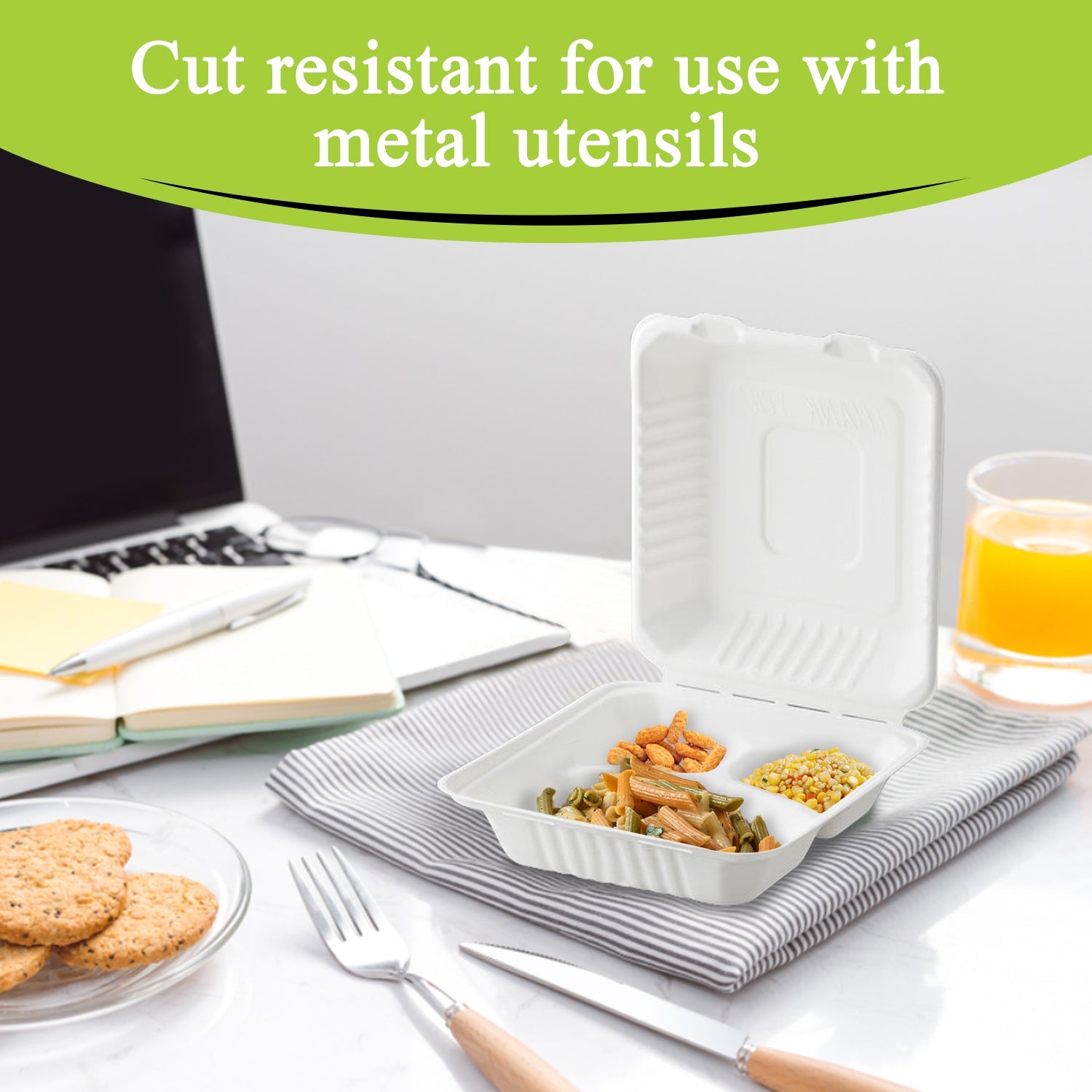 - Sturdy and Hot or Cold Use: These disposable Clamshell are made of a sturdy, relatively rigid organic substance that has a substantial, long-lasting feel and can support heavy food and liquids and cut- and leak-resistant and has no plastic or wax lining.