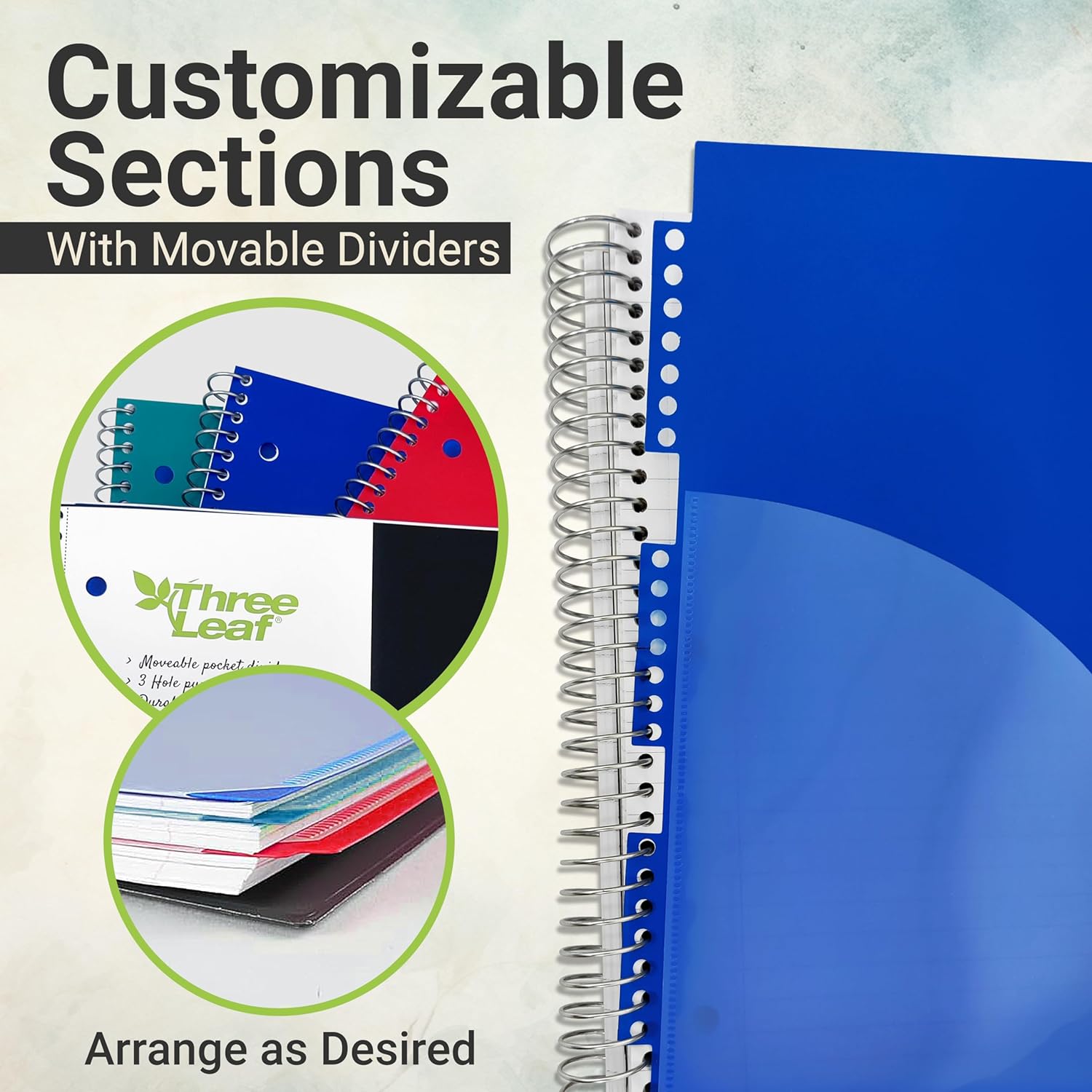 Three Leaf 150 Ct, 10 1/2 X 8, 3-Subject Poly Cover Spiral Notebooks, Wide Ruled, Pocket Divider, Black, Blue, Green, Red.