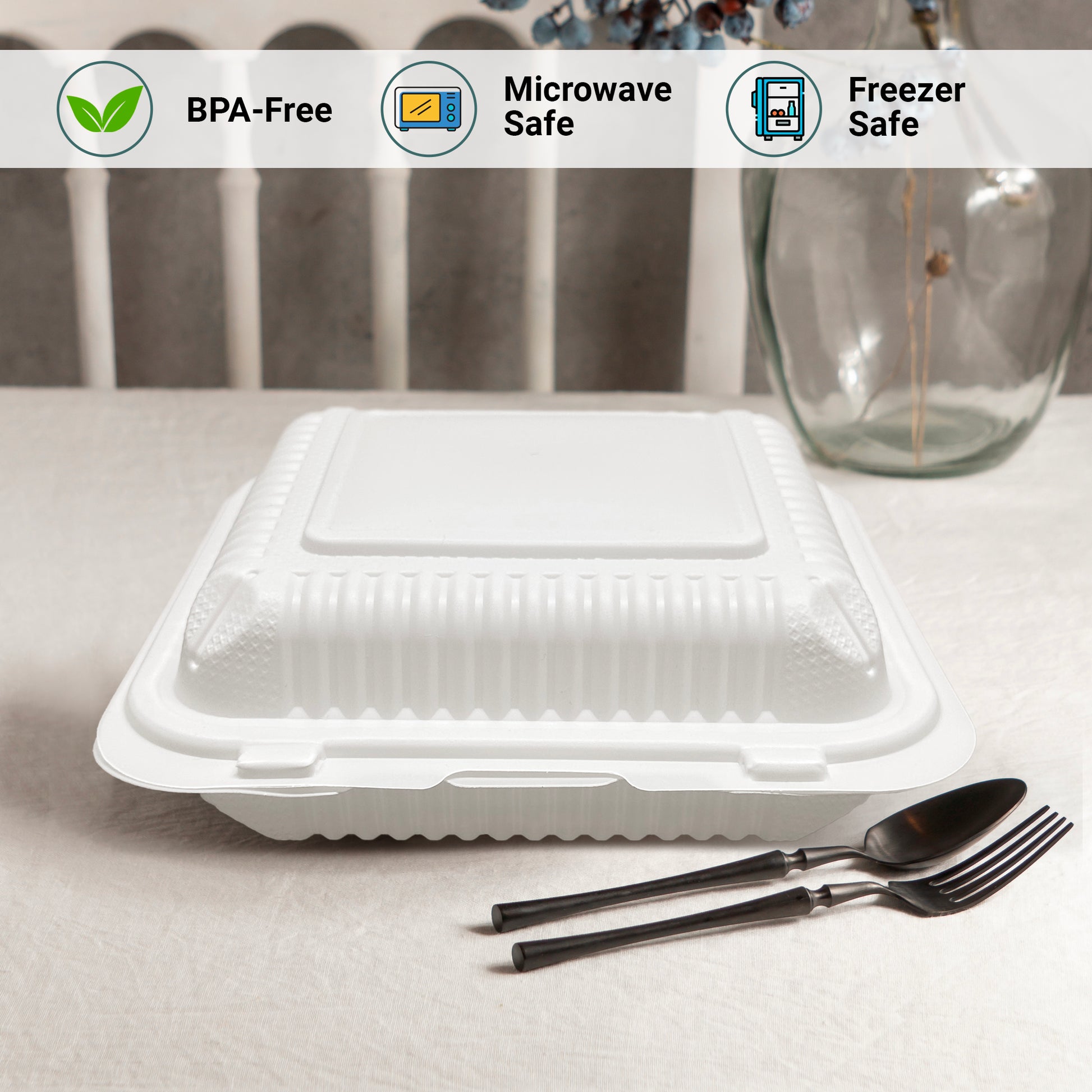 - Durable Mineral-Filled Polypropylene: Made with an average of 50% mineral content blended with polypropylene, these hinged containers reduce plastic usage while maintaining durability and strength.