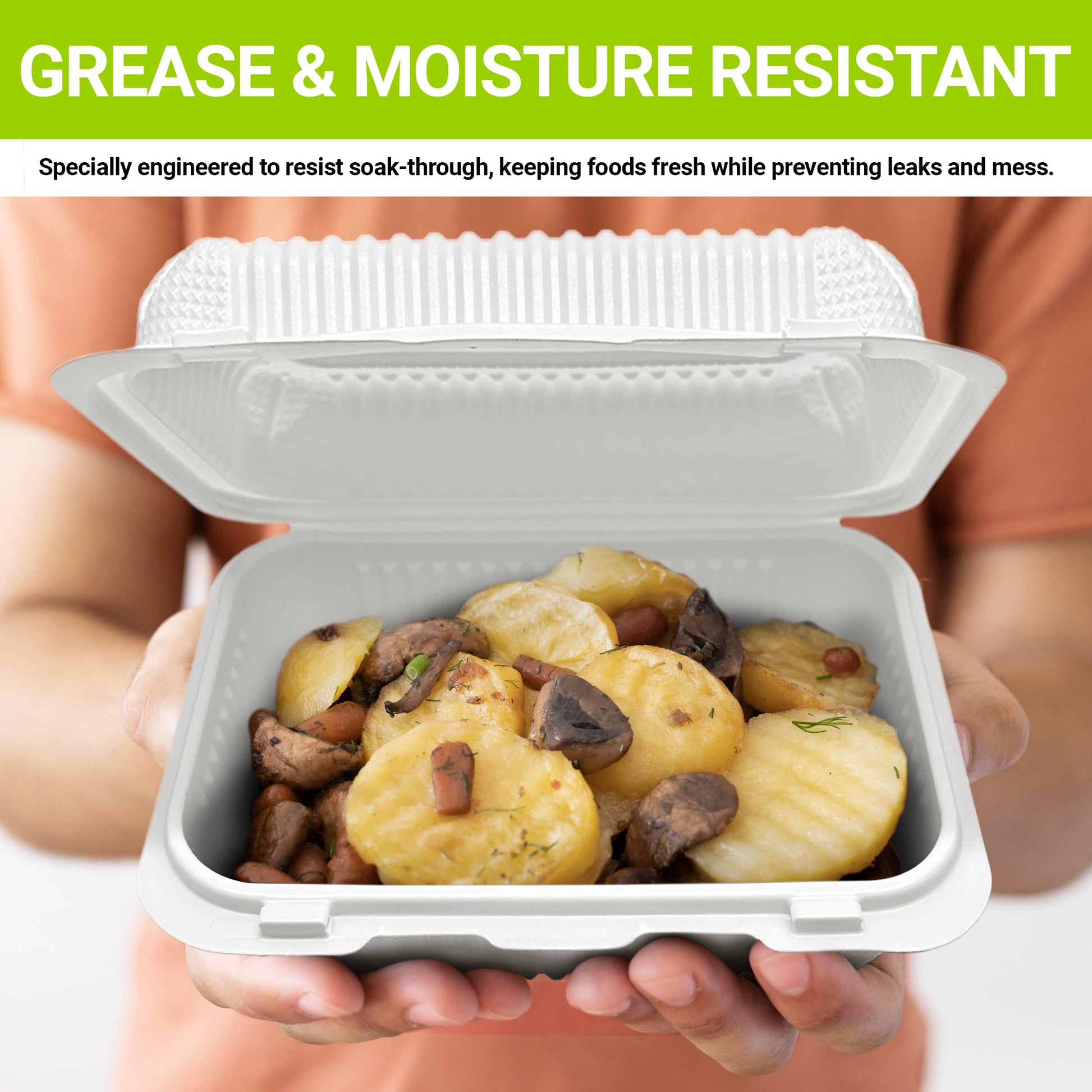 - Durable Mineral-Filled Polypropylene: Made with an average of 50% mineral content blended with polypropylene, these hinged containers reduce plastic usage while maintaining durability and strength.